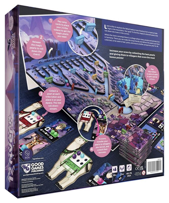 In 12 Rivers, players lead one of four tribes and take turns sending warriors to climb the mountain. The warriors camp near the river to collect Nature's bounties and bring these resources to villagers in need. Warriors can collect more valuable bounties if they move toward the origin of the river, but more camp tools have to be paid as well. After five rounds, the bounties to the villagers will be scored for players based on the rarity.